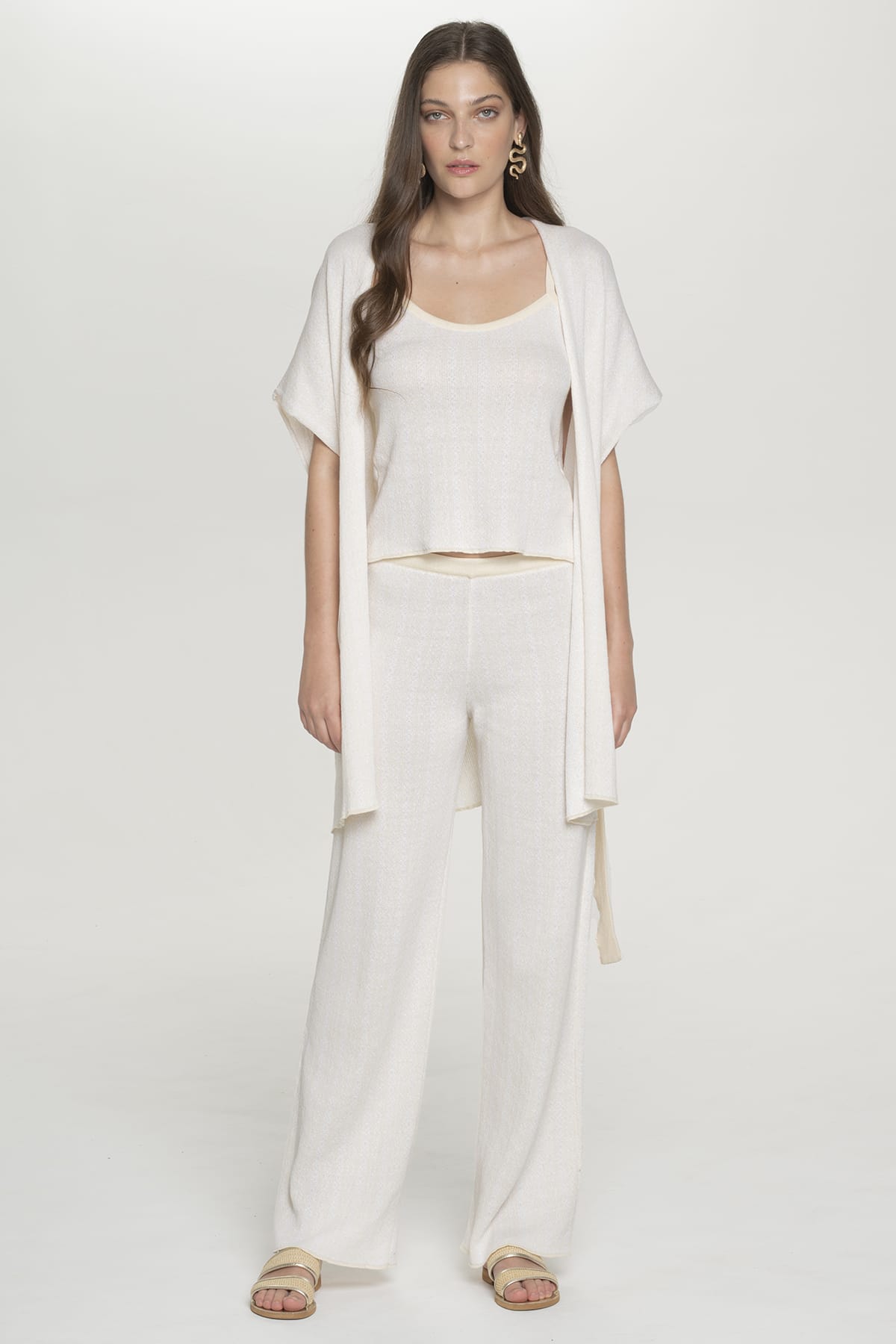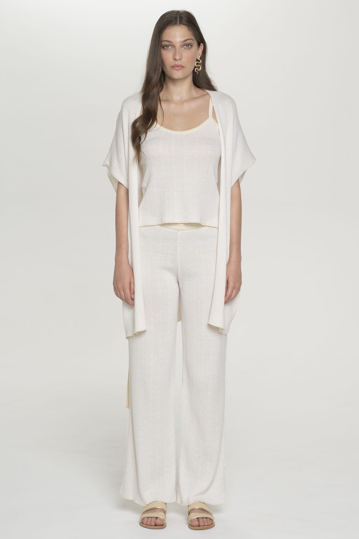 This luxurious cream cami top embodies effortless Mediterranean elegance with its flattering scoop neckline and distinctive triangle back design. The super light, textured knit fabric creates a sophisticated silhouette while providing exceptional comfort, featuring high-quality cotton straps with precision knit linking seam construction, with the fabric pattern incorporating more than 50% undyed raw combed cotton yarn harvested and produced in Greece. Crafted in Greece using Pepper Vally’s signature sustainable practices, this versatile cami showcases premium natural fibers and innovative textile construction. The triangle back detail adds contemporary appeal while the expertly crafted cotton straps ensure durability and refined finishing. The neutral cream tone coordinates seamlessly with matching collection pieces, offering all-day comfort.