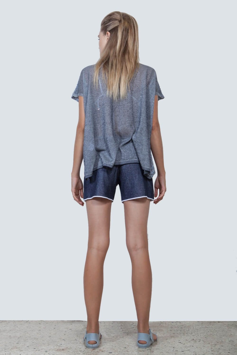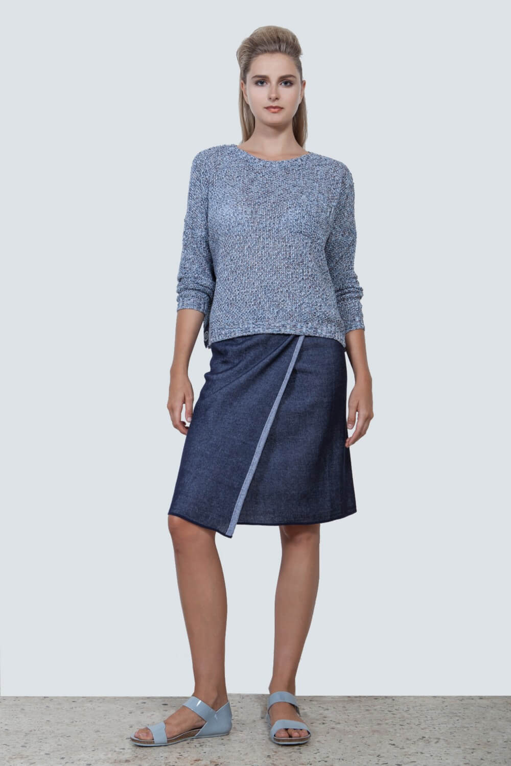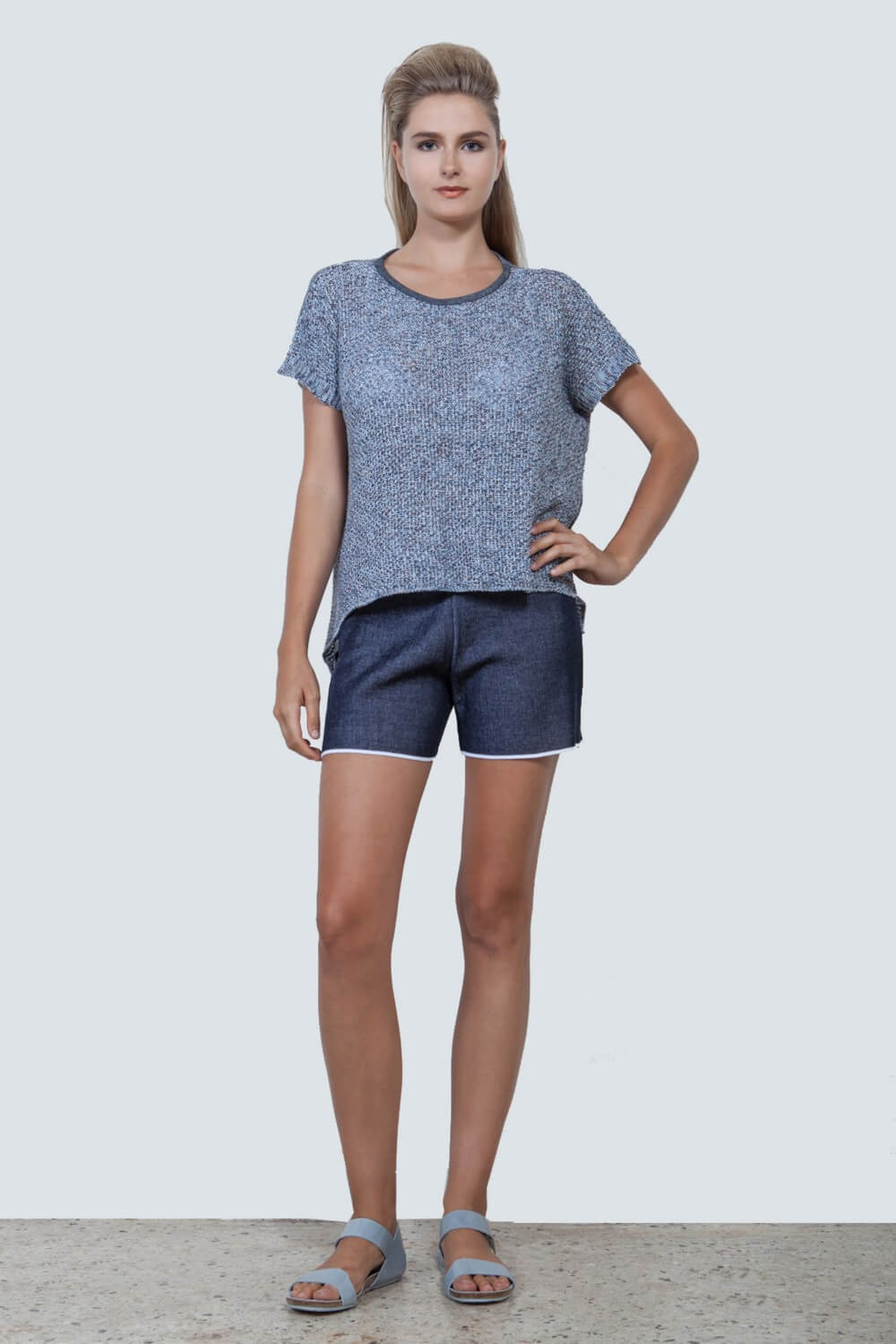 The novelty of THE KNITTED JEANS COLLECTION is based on the result in our research in knitting-pattern techniques for producing a sustainable knitted denim. The outcome is a soft and comfortable fabric reflecting in a total athleisure knitwear look, which still reminds the classic denim look. This style from Pepper Vally’s Jeans Collection shows a selection of the almost unlimited potential in knitting.