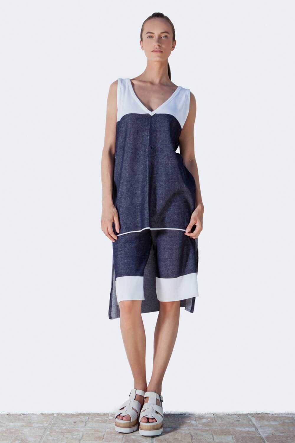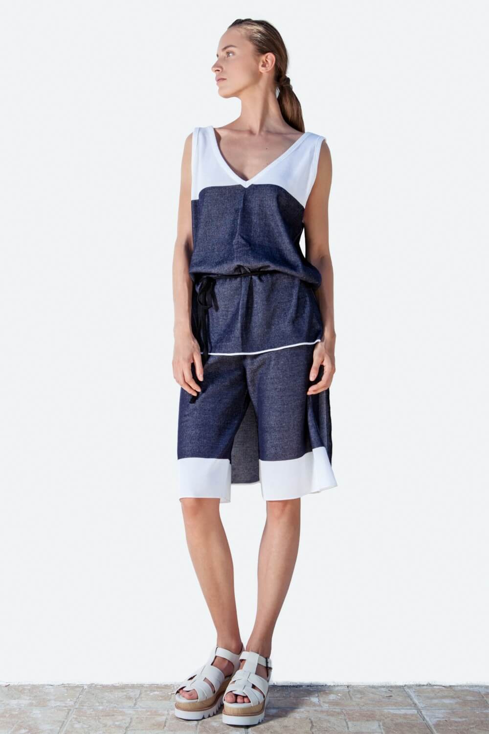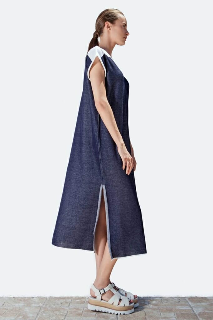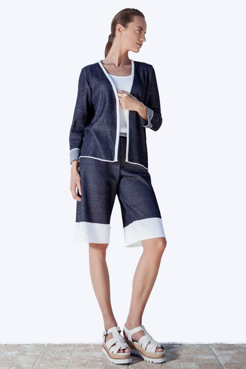 The novelty of THE KNITTED JEANS COLLECTION is based on the result in our research in knitting-pattern techniques for producing a sustainable knitted denim. The outcome is a soft and comfortable fabric reflecting in a total athleisure knitwear look, which still reminds the classic denim look. This style from Pepper Vally’s Jeans Collection shows a selection of the almost unlimited potential in knitting.