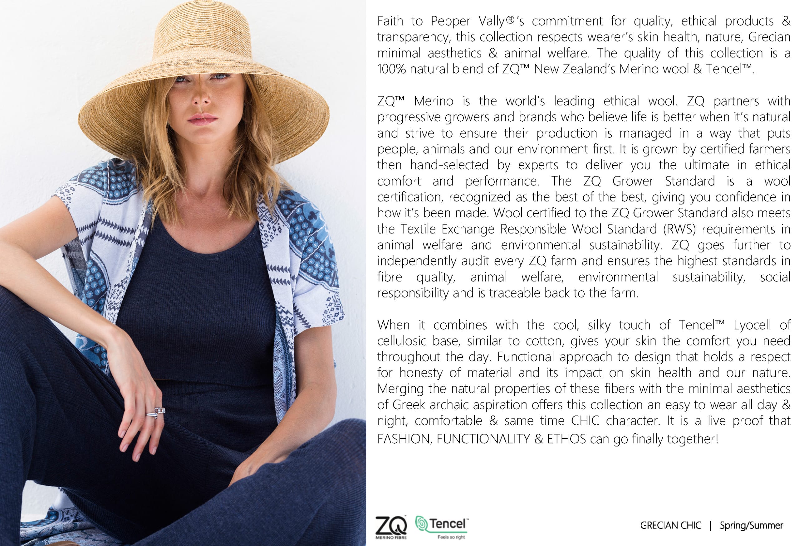 Η ποιότητα αυτής της συλλογής είναι μία 100% φυσική μείξη από μαλλί Μερινός ZQ™ Νέας Ζηλανδίας και Τενσέλ™. Το ZQ™ Μερινός είναι το κορυφαίο ηθικό μαλλί στον κόσμο, συνεργαζόμενο με προοδευτικούς καλλιεργητές στη Νέα Ζηλανδία και επωνυμίες που πιστεύουν ότι η ζωή είναι καλύτερη όταν είναι φυσική. Η διαχείριση της παραγωγής γίνεται με τρόπο που θέτει τους ανθρώπους, τα ζώα και το περιβάλλον μας πρώτα.