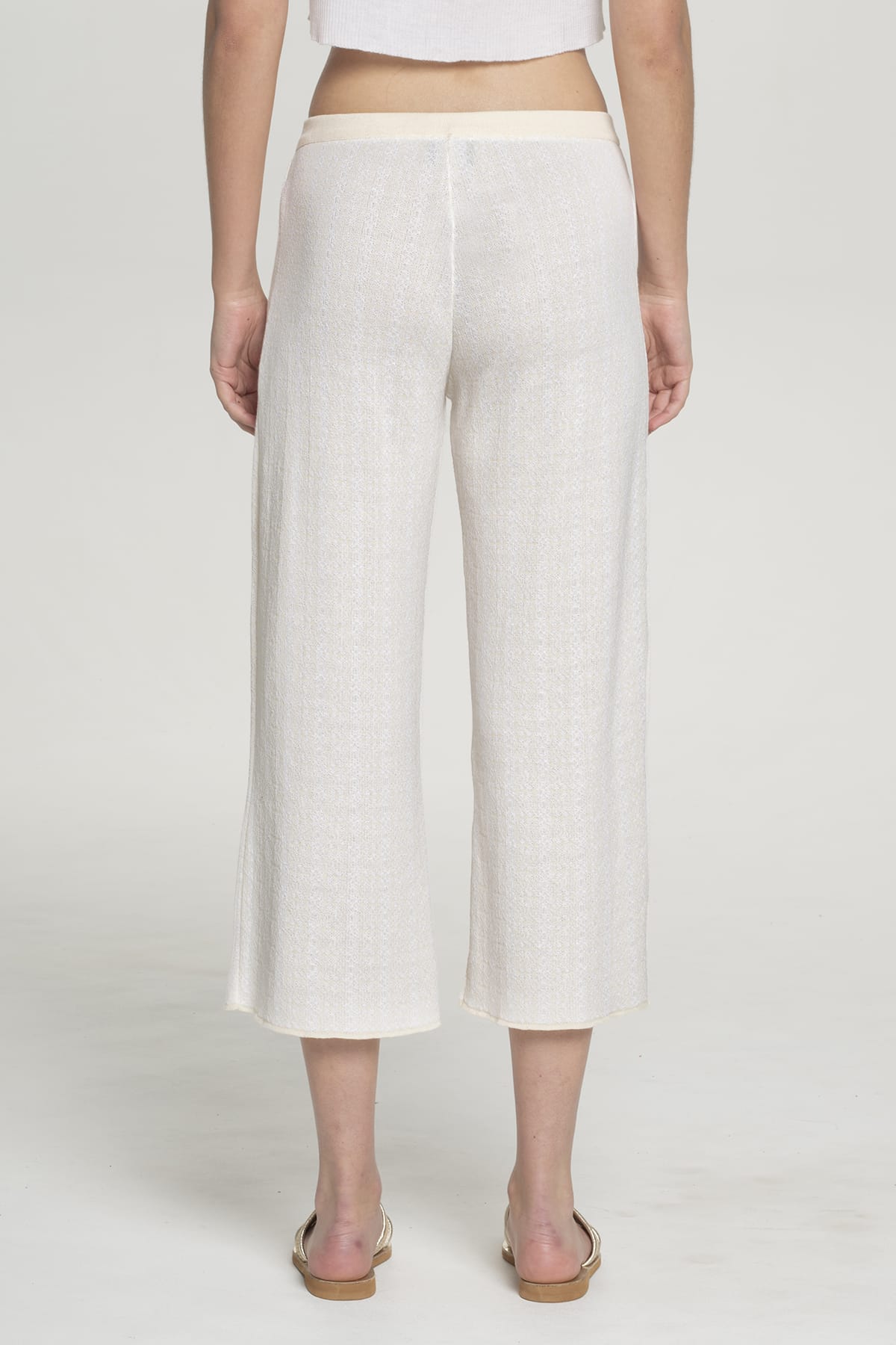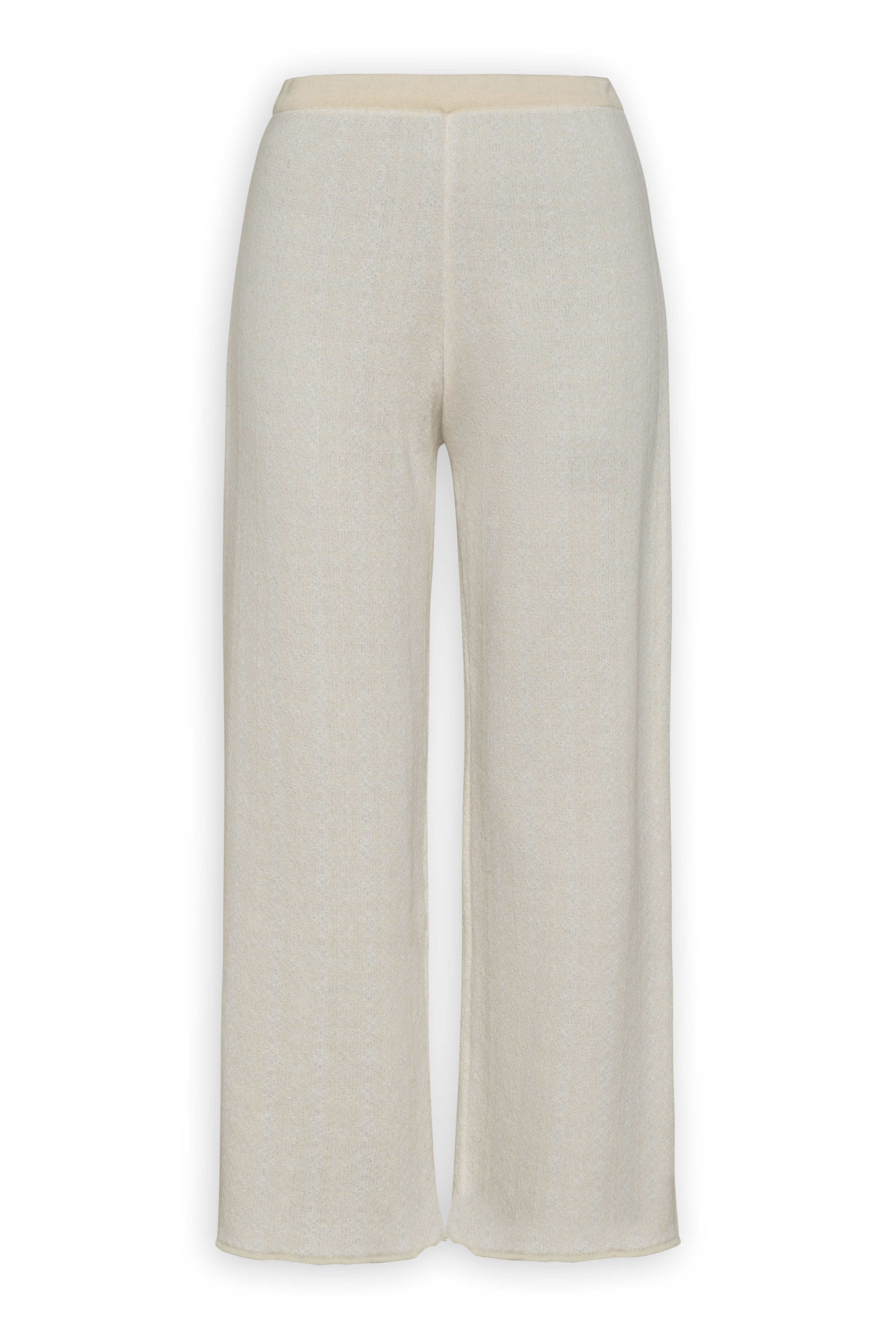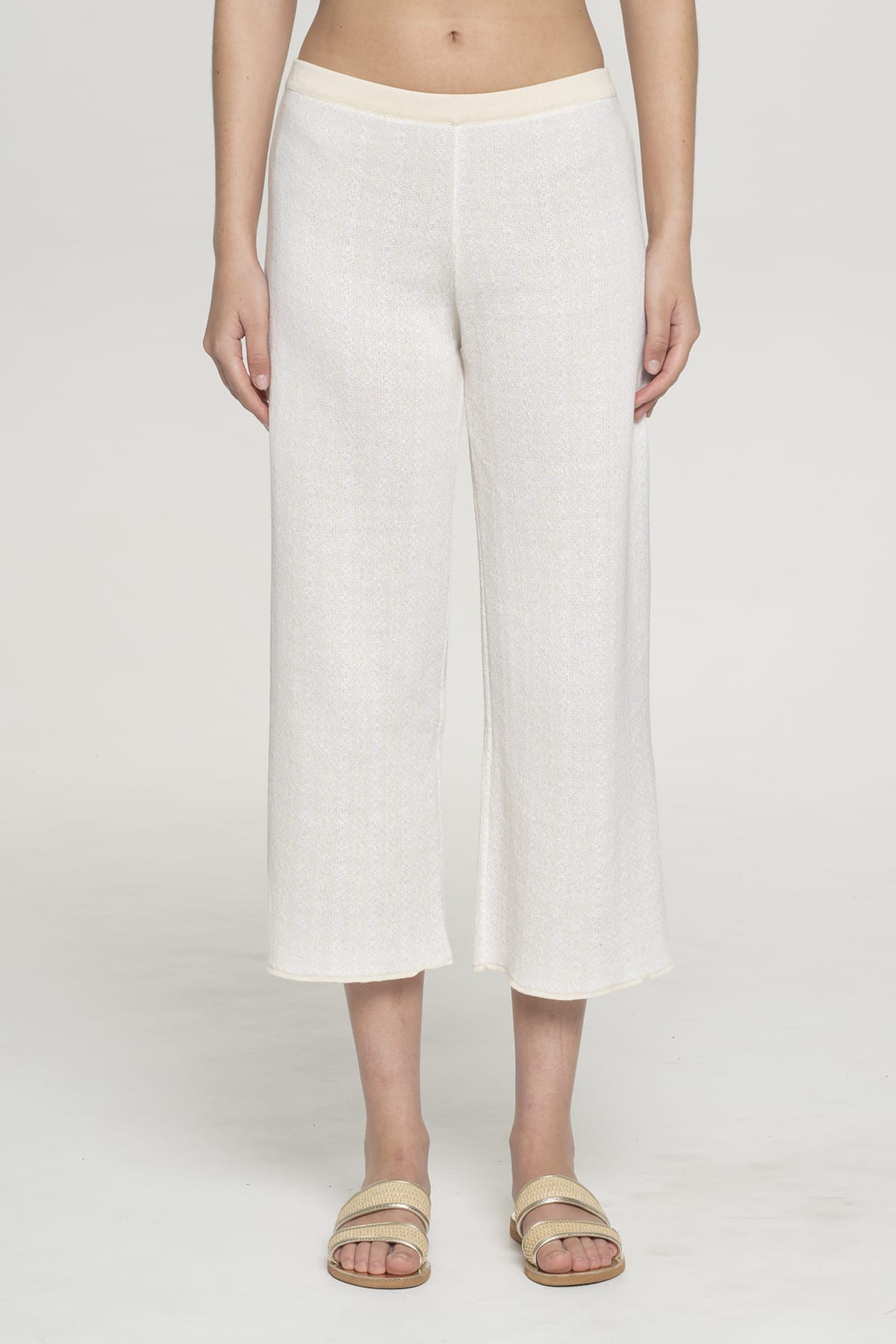Αυτό το κομψό κρεμ παντελόνι wide-leg αναδεικνύει τη μεσογειακή κομψότητα με τη ρέουσα cropped σιλουέτα και την ίσια wide-leg εφαρμογή.