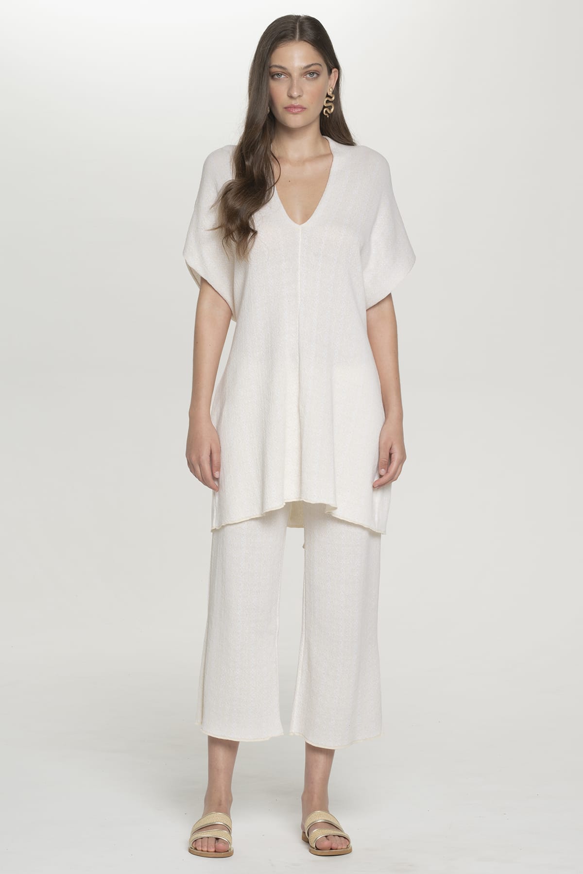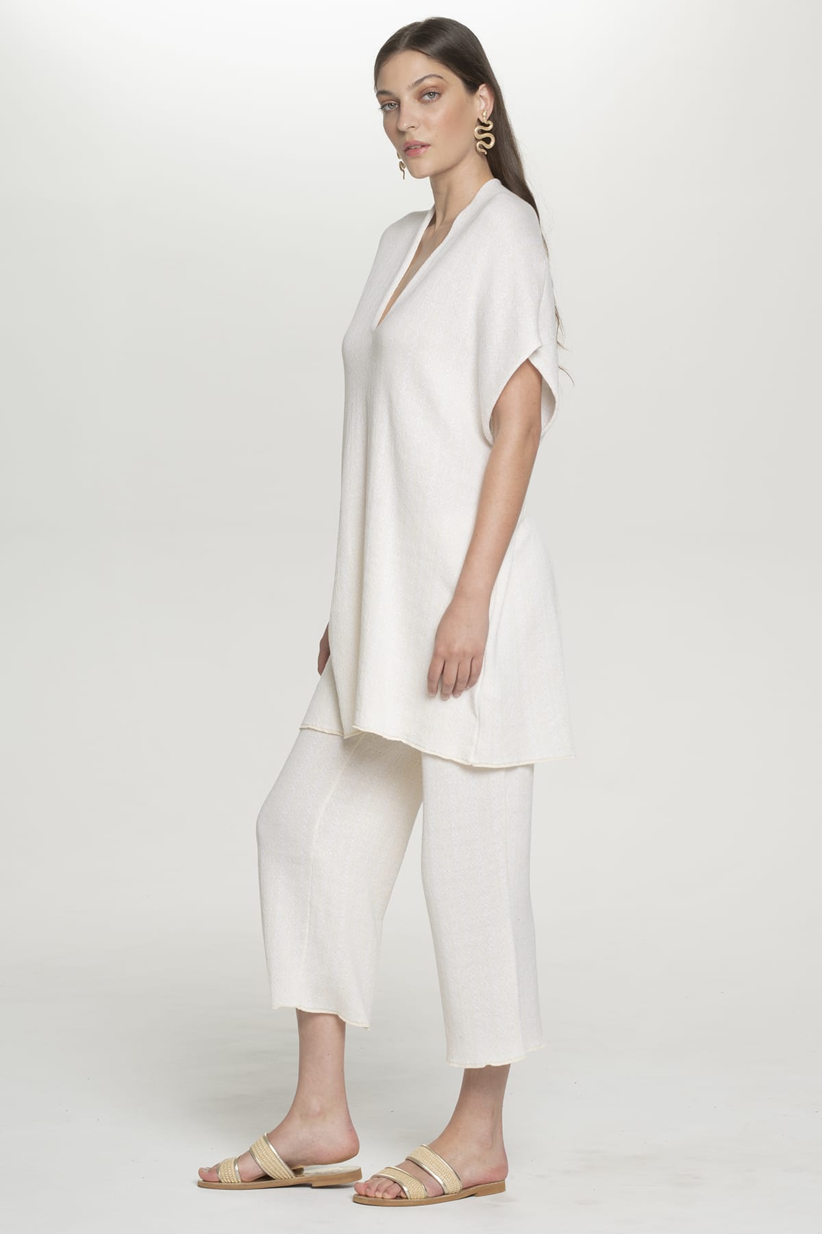 Αυτό το κομψό κρεμ παντελόνι wide-leg αναδεικνύει τη μεσογειακή κομψότητα με τη ρέουσα cropped σιλουέτα και την ίσια wide-leg εφαρμογή. Το εξαιρετικά ελαφρύ, πλεκτό ύφασμα δημιουργεί χαριτωμένη κίνηση διατηρώντας τη δομή, με κολακευτικό μήκος 3/4 και και το ψηλόμεσο κόψιμο που αναδεικνύει όμορφα τους αστραγάλους. Κατασκευασμένο στην Ελλάδα με τις βιώσιμες πρακτικές της Pepper Vally, περιλαμβάνει περισσότερο από 50% αβαφο ακατέργαστο χτενισμένο βαμβακερό νήμα ελληνικής προέλευσης. Το ελαστικό ζωνάκι εξασφαλίζει τέλεια εφαρμογή ενώ το wide-leg κόψιμο προσφέρει αβίαστη κομψότητα κατάλληλη για παραθαλάσσιες βόλτες και εκλεπτυσμένες περιστάσεις. Ο ουδέτερος κρεμ τόνος συνδυάζεται άψογα με τα υπόλοιπα κομμάτια της συλλογής.