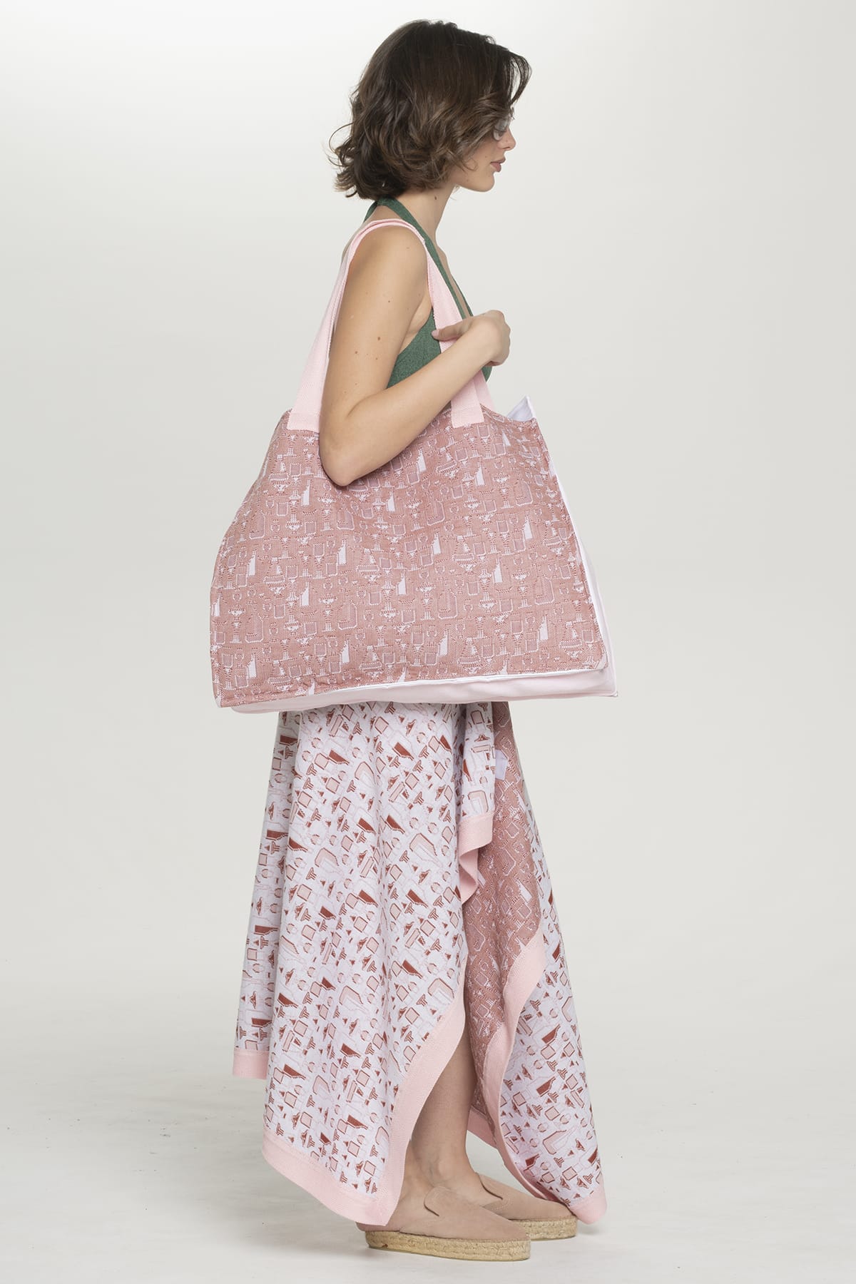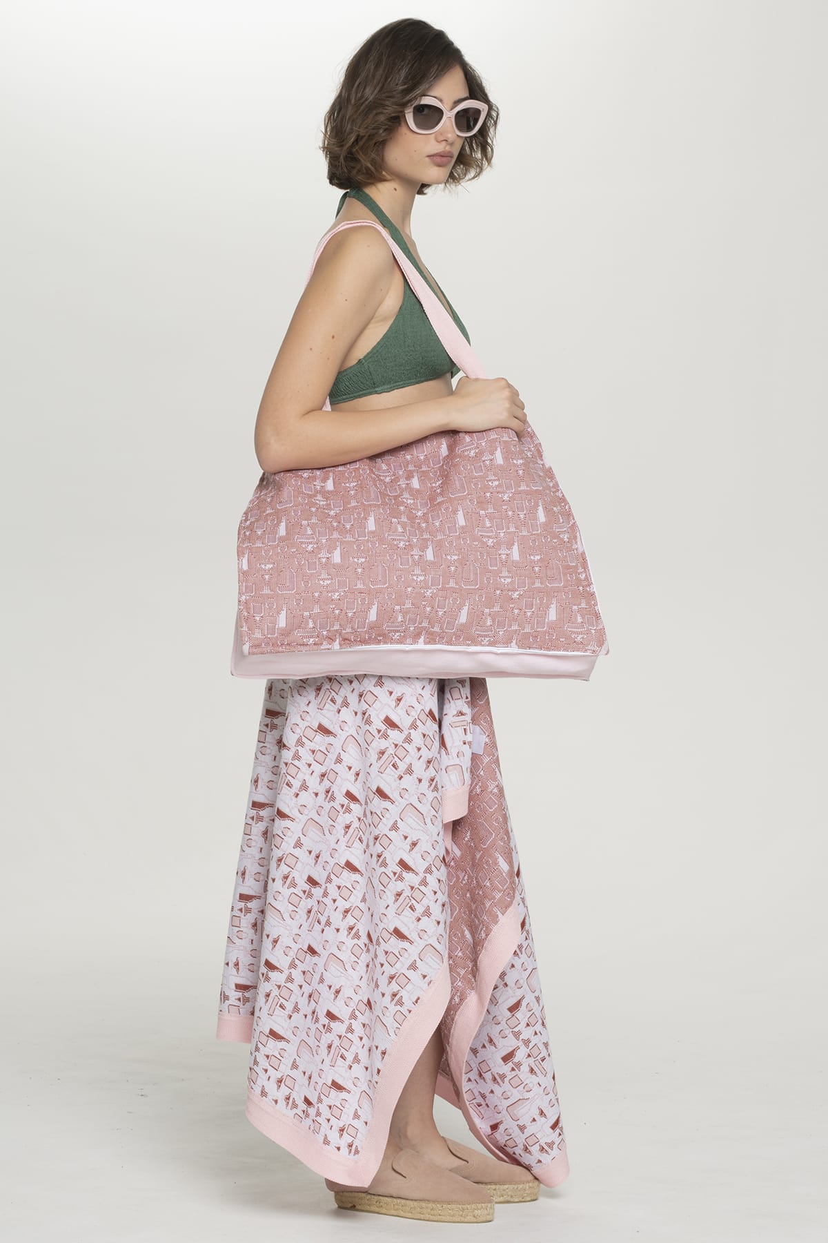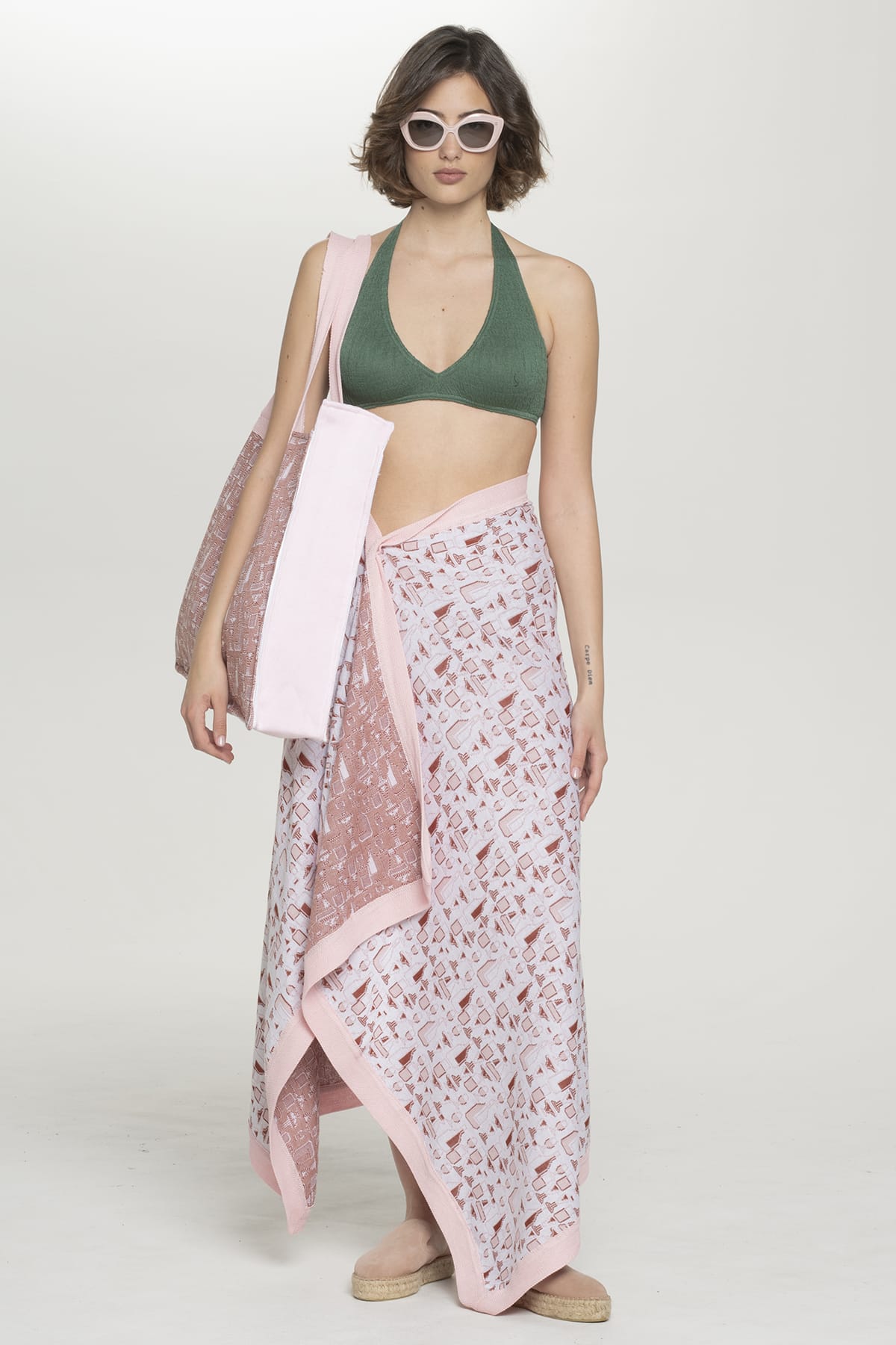 Η πετσέτα θαλάσσης “Cocktails & Dreams Sunrise” της Pepper Vally αποτυπώνει την ουσία του μεσογειακού δειλινού με εκλεπτυσμένα γεωμετρικά μοτίβα σε εκάι και κοραλί ροζ. Τα γοητευτικά σχέδια εμπνευσμένα από τα χρώματα του ηλιοβασιλέματος και τα απολαυστικά κοκτέιλς σε ζακάρ ύφασμα διπλής όψης, σας χαρίζει δύο κομψές εμφανίσεις σε μία. Κατασκευασμένη στο εργαστήριό μας στην Αθήνα από 100% υδρόφιλο πεννιέ βαμβάκι, η πετσέτα είναι ελαφριά και απορροφητική, ενώ στεγνώνει περίπου στο μισό χρόνο από τη συνηθισμένη terry. Η άμμο-ανθεκτική ύφανσή της τυλίγεται σφιχτά για να εξοικονομήσει πολύτιμο χώρο στην τσάντα θαλάσσης σας, ενώ η γενναιόδωρη, φυσικά ελαστική φύση της μεταμορφώνεται αβίαστα σε παρεό, σάλι, φουλάρι, ριχτάρι, κάλυμμα ξαπλώστρας ή κομψή πετσέτα άμμου για τις μέρες στη θάλασσα, αλλά και για πικνίκ στη φύση. Συνοδεύει άψογα τα βαμβακερά μαγιό μας σε ταιριαστά χρώματα.