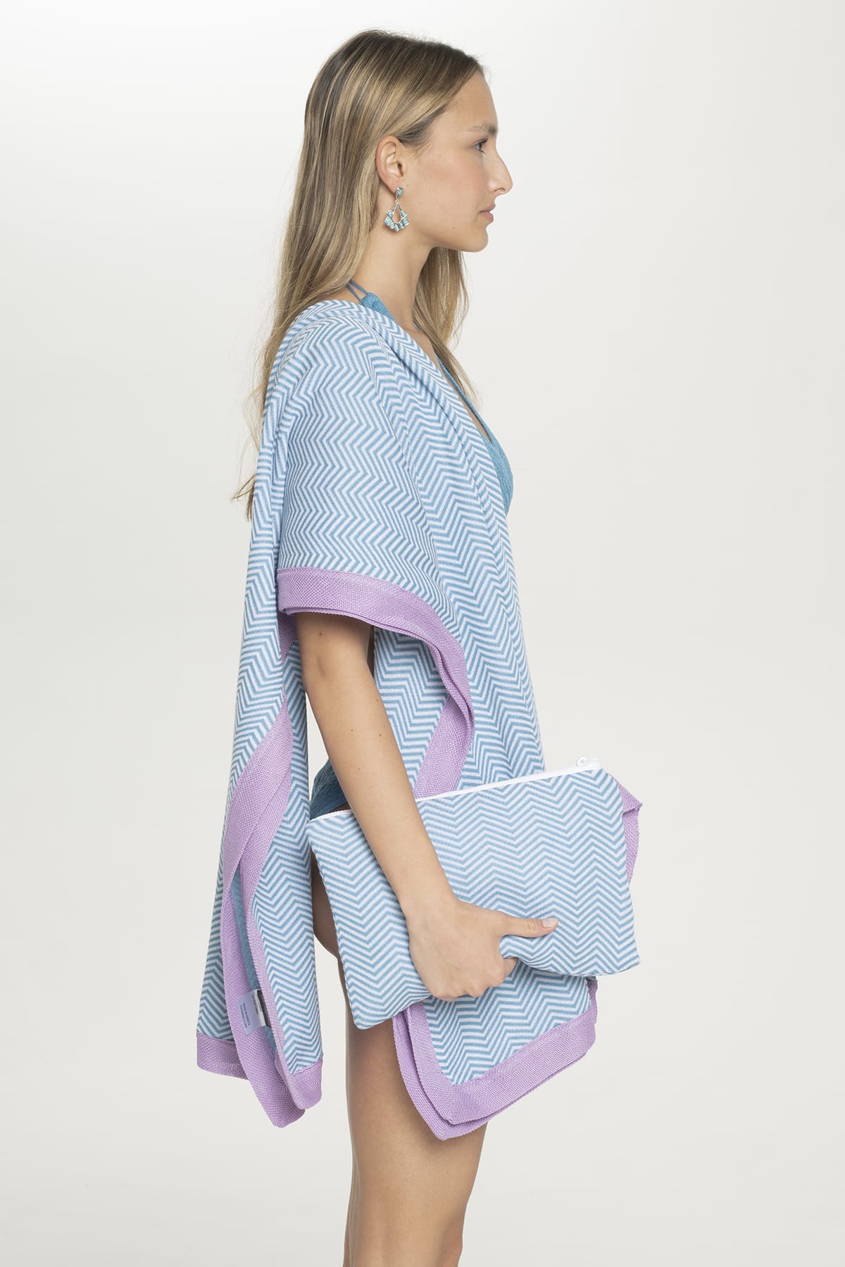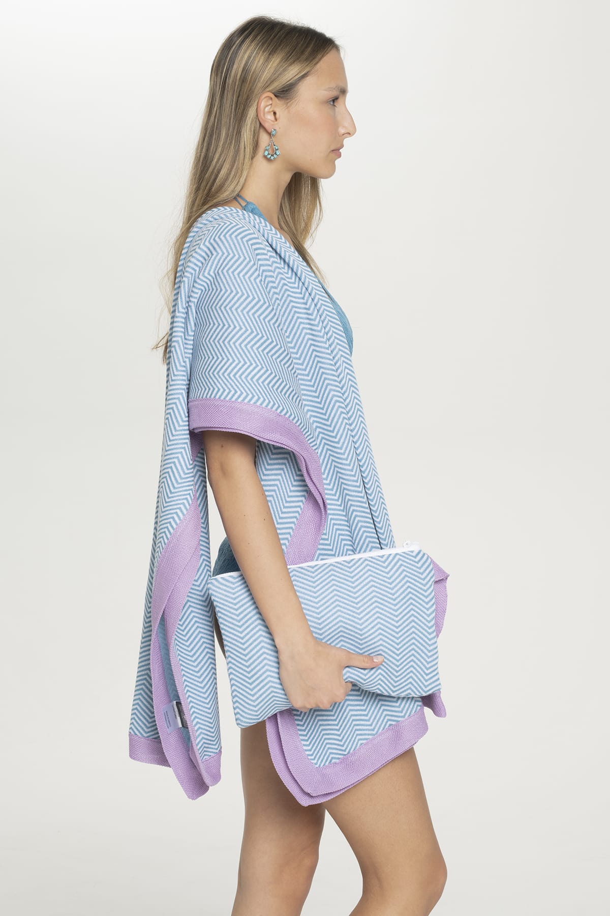 Η πετσέτα θαλάσσης “Illusion” της Pepper Vally μαγεύει με τα υπνωτικά ζικ ζακ σχέδια στο μπλε του Αιγαίου και καθαρό λευκό, ενώ η κομψή τρέσσα σε λιλά χρώμα προσδίδει μια ενδιαφέρουσα πινελιά.
