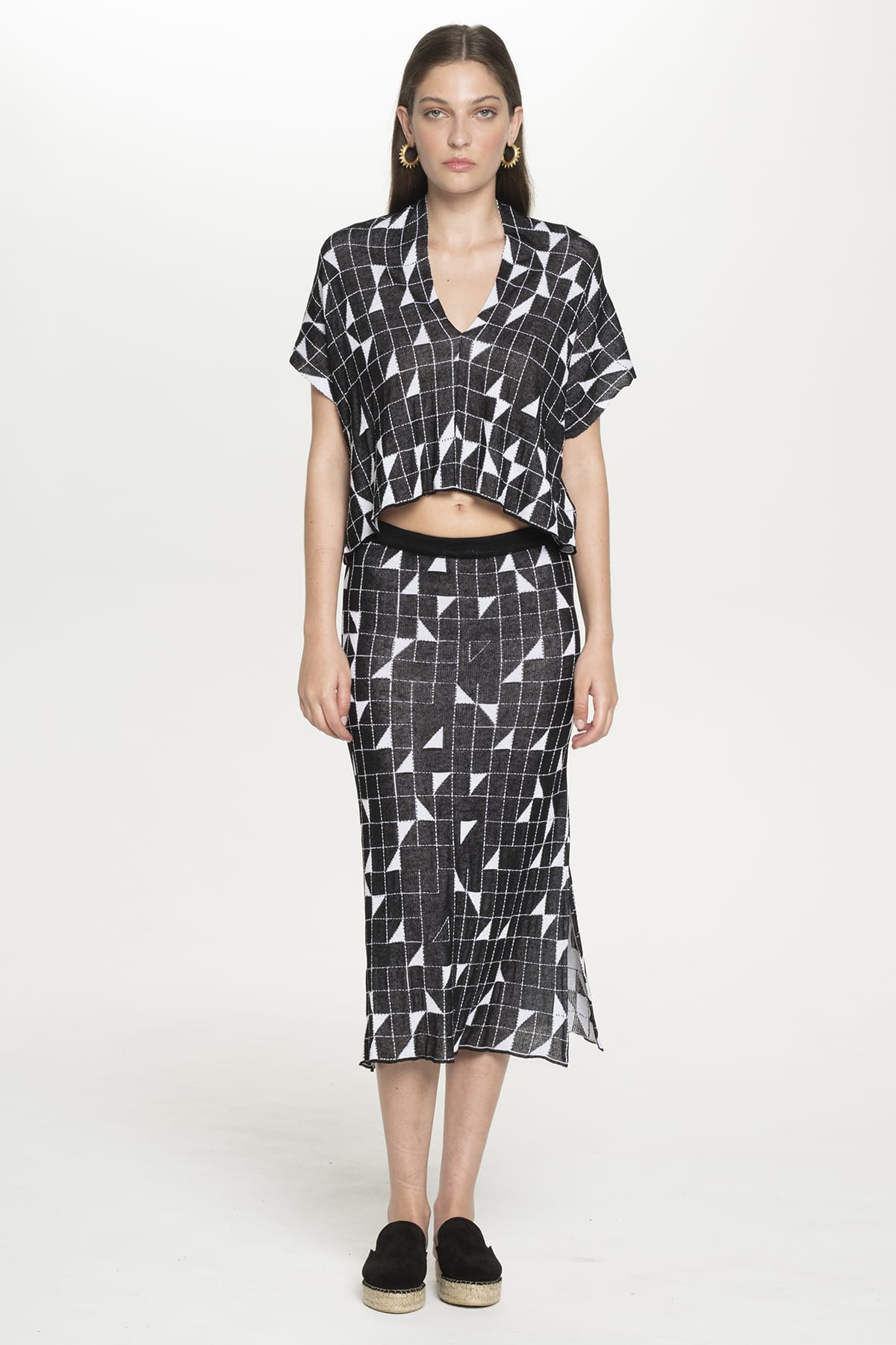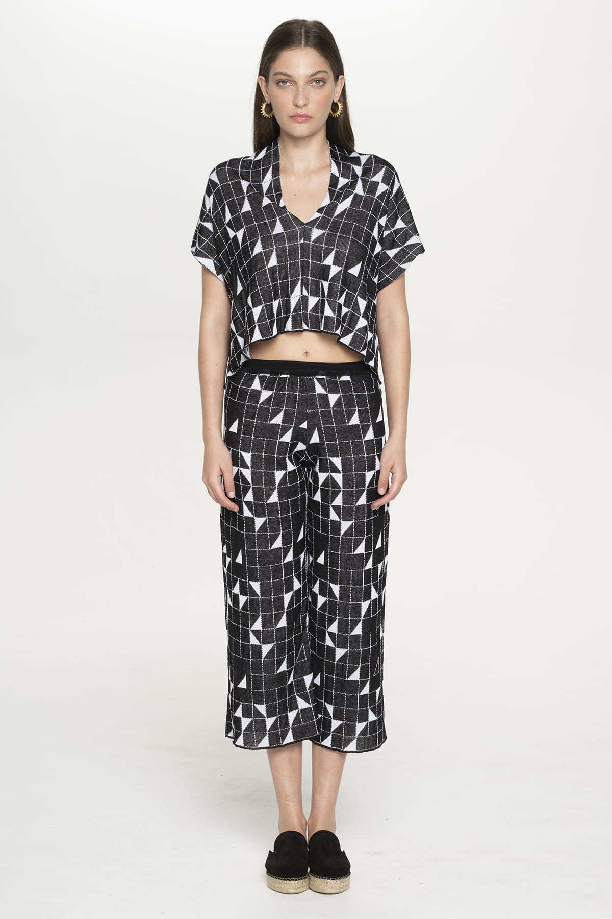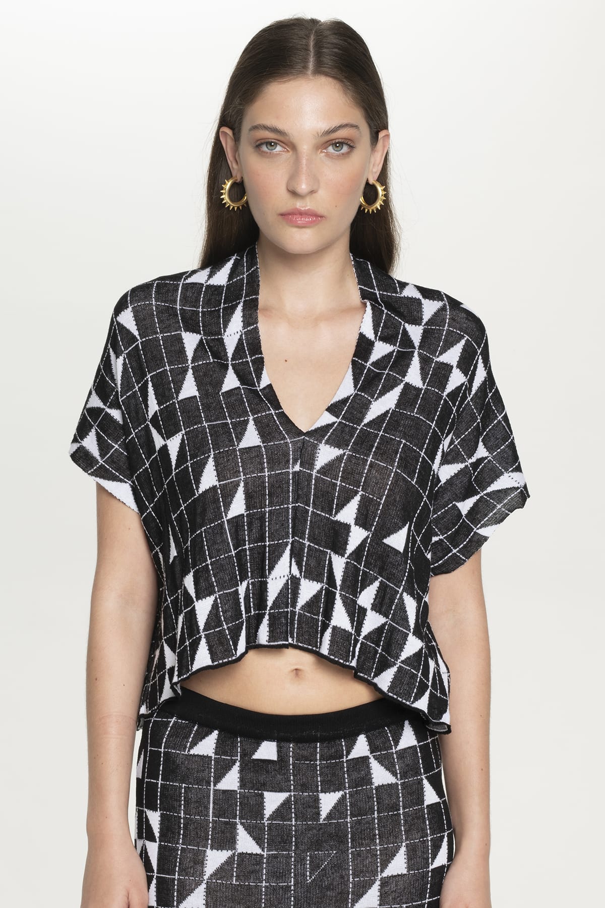 Αυτό το εντυπωσιακό crossroads μαύρο-άσπρο τοπ ενσωματώνει τη σύγχρονη ελληνική κομψότητα με τη χαλαρή V-neck σιλουέτα και τα κοντά μανίκια. Το έντονο γεωμετρικό crossroads μοτίβο εμπνέεται από τις αρχιτεκτονικές γραμμές των ελληνικών νησιών και χωριών, δημιουργώντας κομψή αντίθεση που αναβαθμίζει κάθε outfit. Το μαλακό, πλεκτό ύφασμα δημιουργεί κολακευτικό cropped μήκος που συνδυάζεται άψογα με ψηλόμεσα κομμάτια για μοντέρνο styling. Κατασκευασμένο στην Ελλάδα με τις βιώσιμες πρακτικές της Pepper Vally, αυτό το ευέλικτο κομμάτι διαθέτει premium φυσικές ίνες και καινοτόμα κατασκευή υφάσματος. Συνδυάζεται άψογα με την φούστα ή/και το σορτς στο ίδιο σχέδιο.