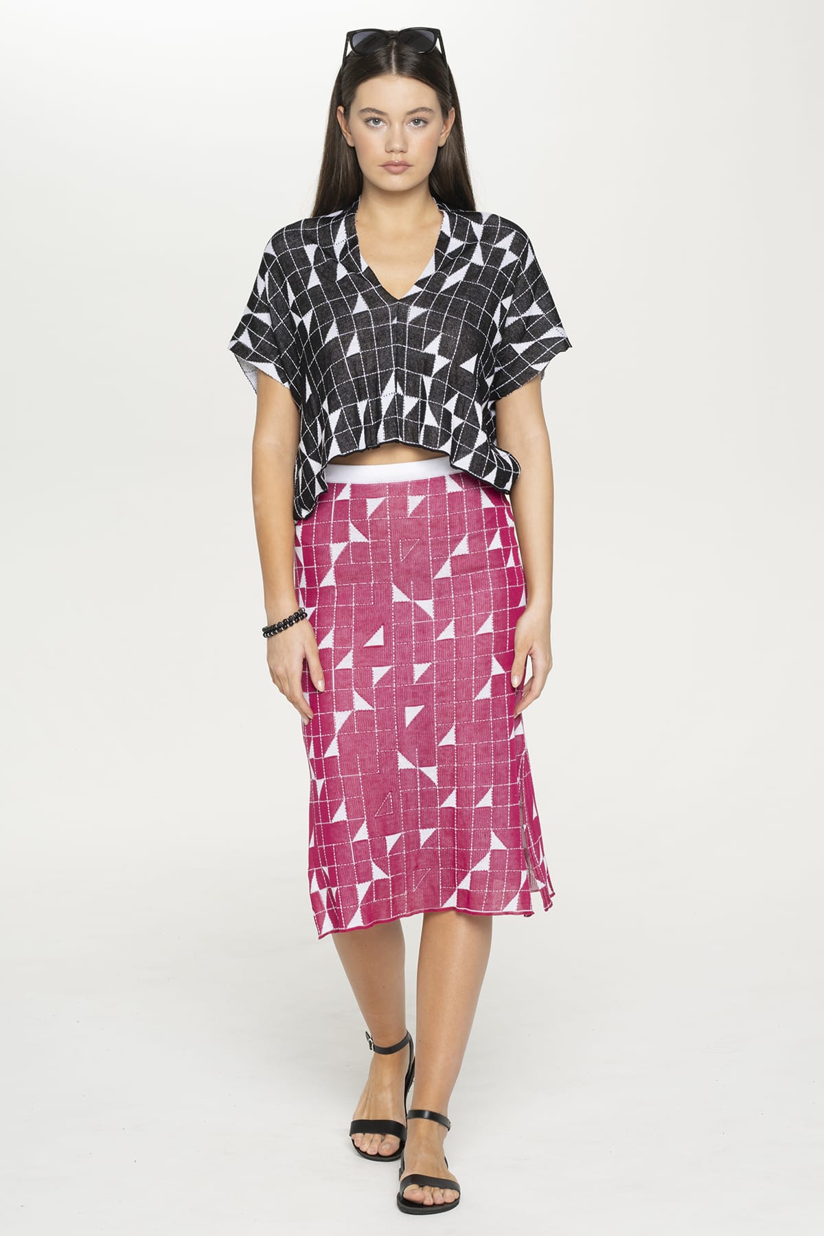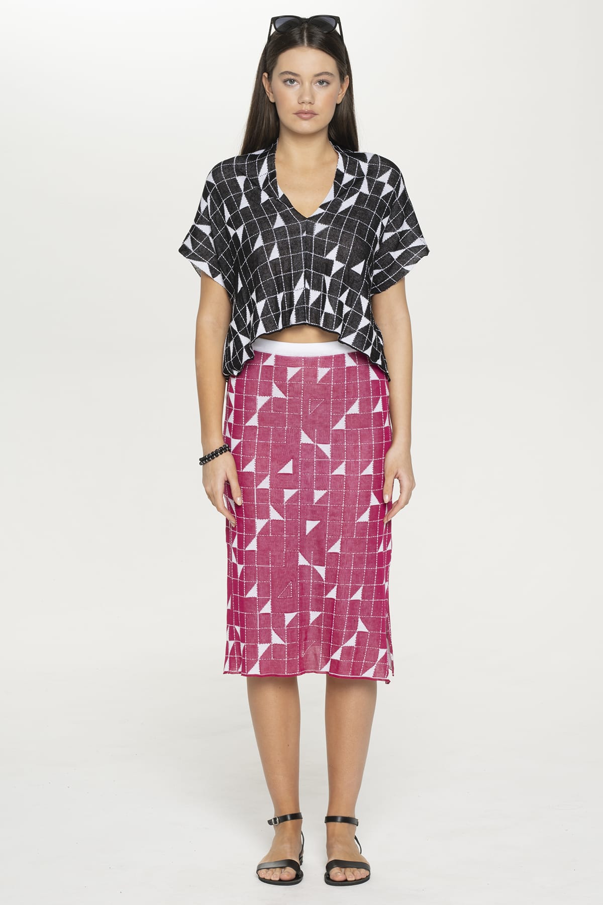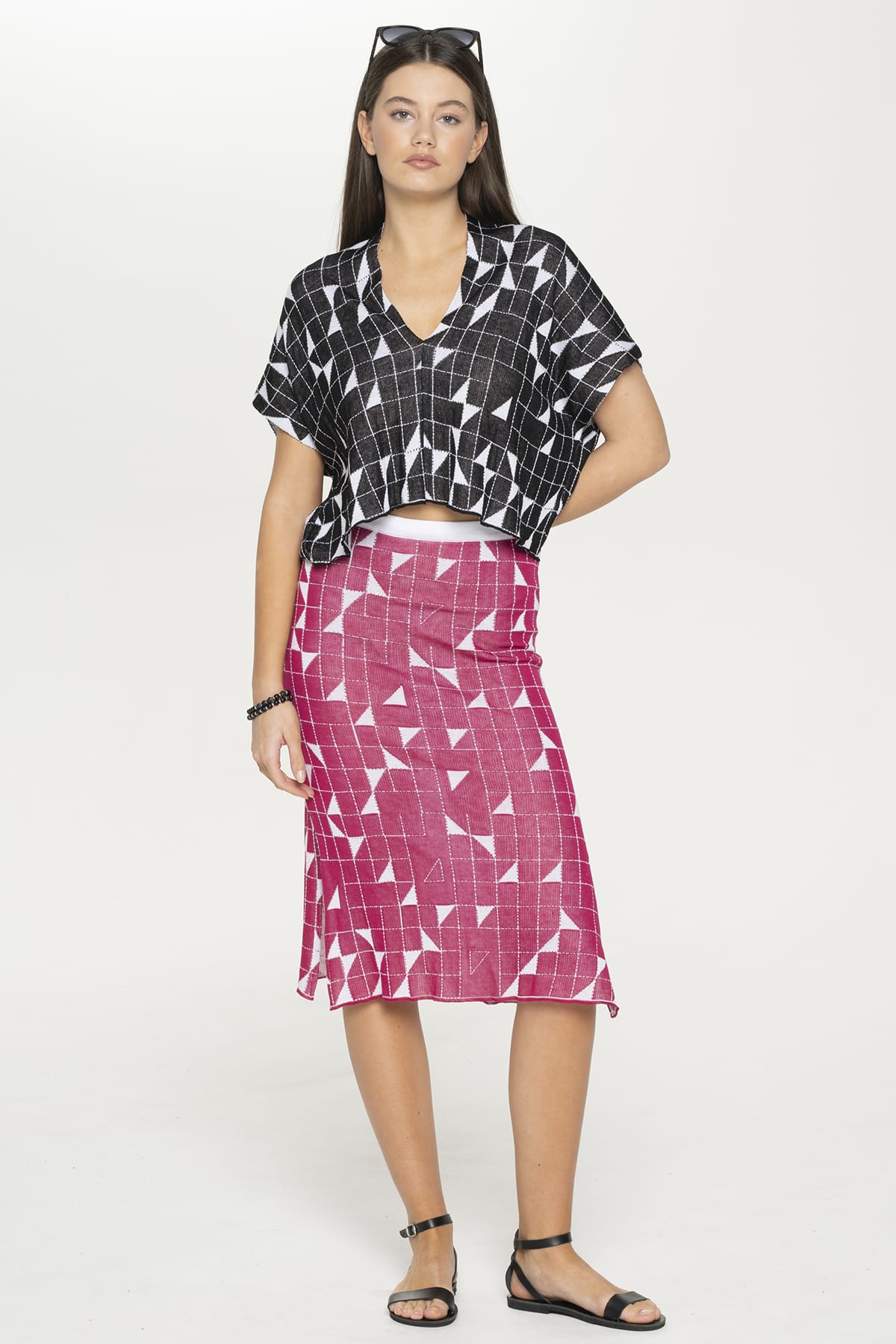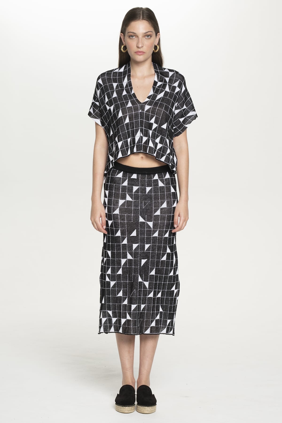 Αυτό το εντυπωσιακό crossroads μαύρο-άσπρο τοπ ενσωματώνει τη σύγχρονη ελληνική κομψότητα με τη χαλαρή V-neck σιλουέτα και τα κοντά μανίκια. Το έντονο γεωμετρικό crossroads μοτίβο εμπνέεται από τις αρχιτεκτονικές γραμμές των ελληνικών νησιών και χωριών, δημιουργώντας κομψή αντίθεση που αναβαθμίζει κάθε outfit. Το μαλακό, πλεκτό ύφασμα δημιουργεί κολακευτικό cropped μήκος που συνδυάζεται άψογα με ψηλόμεσα κομμάτια για μοντέρνο styling. Κατασκευασμένο στην Ελλάδα με τις βιώσιμες πρακτικές της Pepper Vally, αυτό το ευέλικτο κομμάτι διαθέτει premium φυσικές ίνες και καινοτόμα κατασκευή υφάσματος. Συνδυάζεται άψογα με την φούστα ή/και το σορτς στο ίδιο σχέδιο.